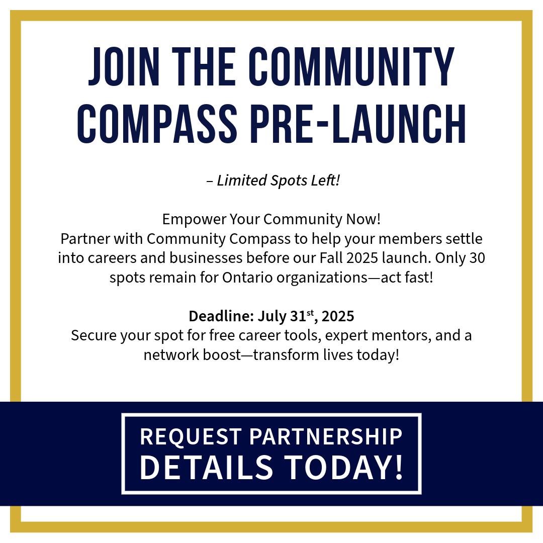 The Compass Network’s Business Compass is designed to help newcomer, immigrant, and community organizations empower their members to thrive as entrepreneurs in Ontario. Our platform provides tailored business coaching, a vetted marketplace of professionals, and resources to overcome barriers like funding and networking. Partner with us to offer your community free business assessments, mentoring, and access to our marketplace—let’s build a stronger, more inclusive future together! Contact us today to explore this opportunity.